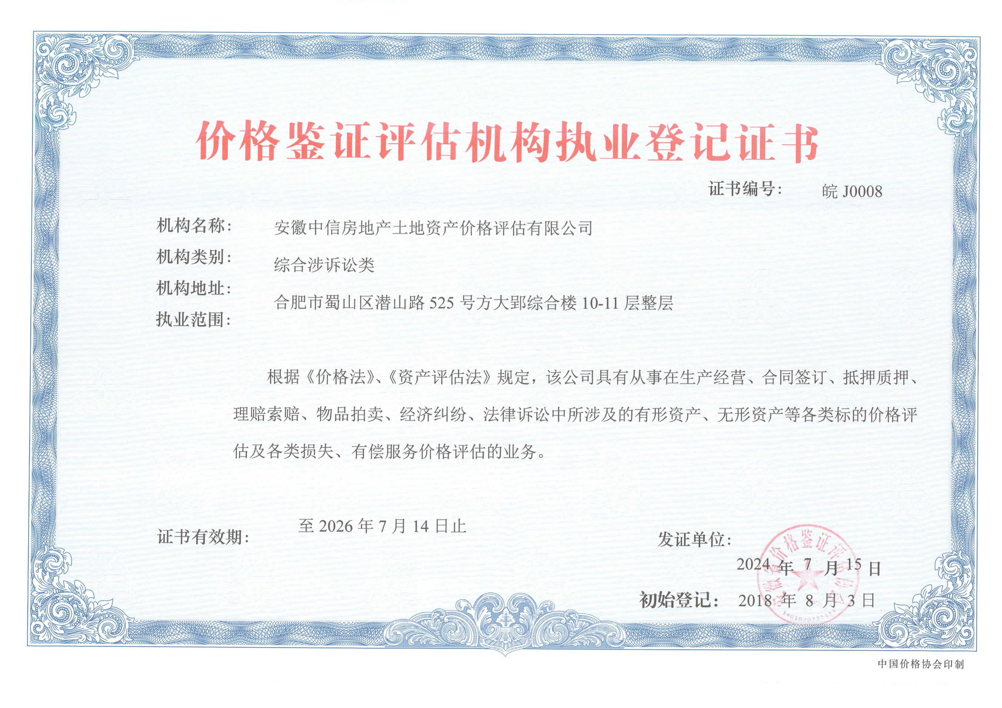 價格評估機構執業登記證書