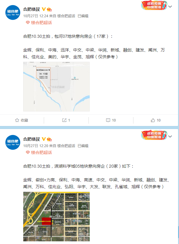 另外,據微博@合肥樓叔的消息,30日合肥土地拍賣意向拿地房企名單曝光。