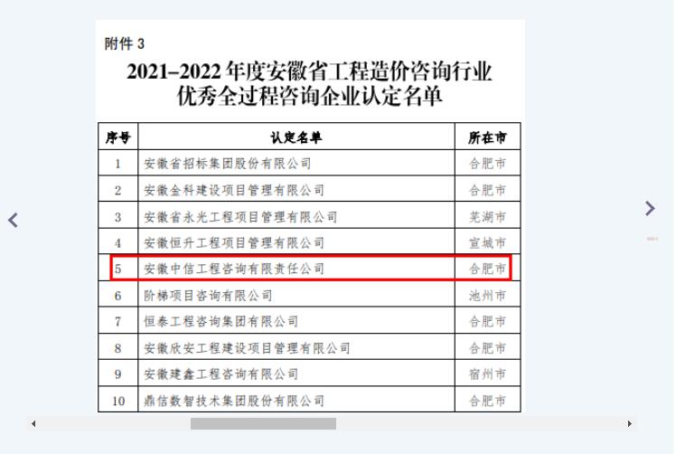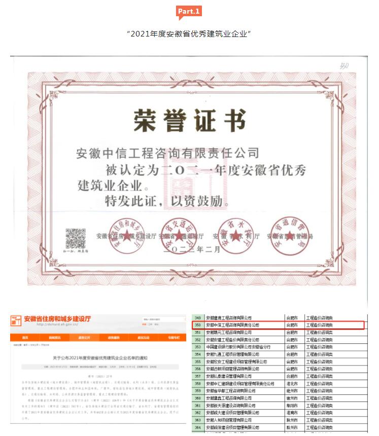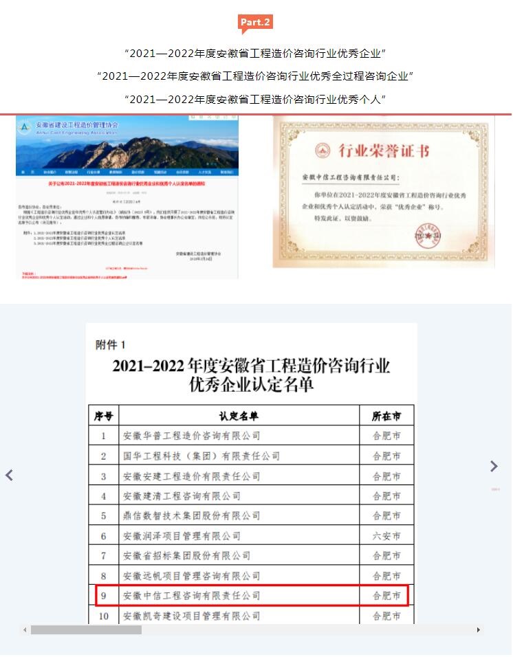 此外, 在安徽省建設工程造價管理協會組織的首次評優評先活動中,中信工程公司入選“2021—2022年度安徽省工程造價咨詢行業優秀企業”、“2021—2022年度安徽省工程造價咨詢行業優秀全過程咨詢企業”,汪姜峰榮獲“2021—2022年度安徽省工程造價咨詢行業優秀個人”獎項。