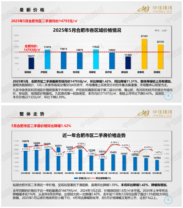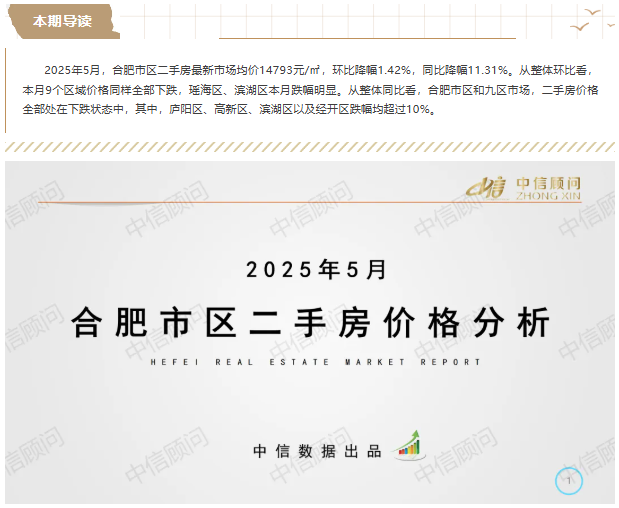 二手房市場(chǎng) | 2025年5月,合肥住宅均價(jià)1.48萬(wàn)元/㎡,環(huán)比下降1.42%,同比下降11.31%